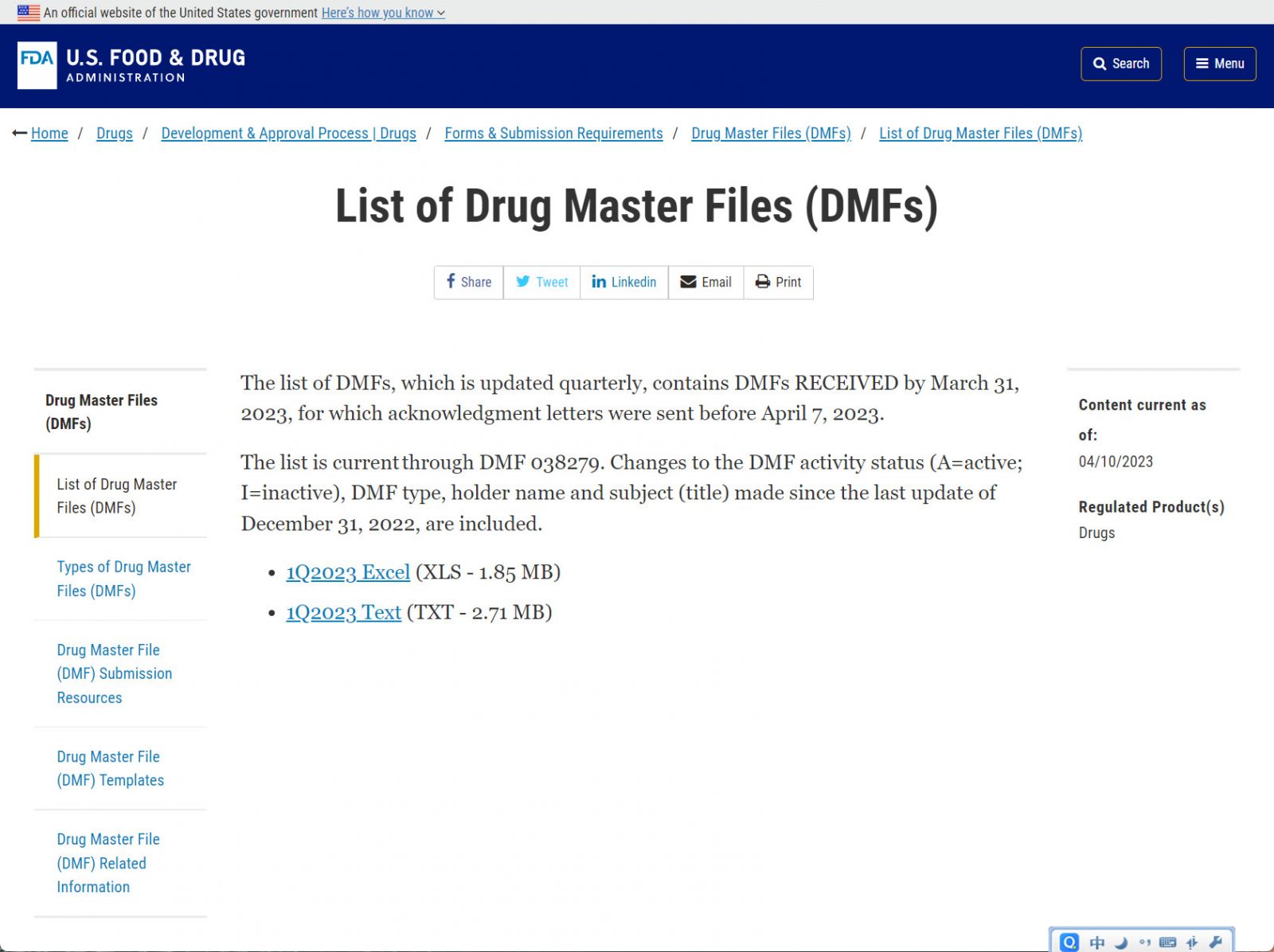 FDA链接://www.fda.gov/drugs/drug-master-files-dmfs/list-drug-master-files-dmfs