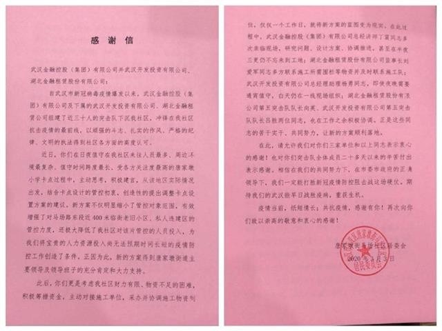 2月20日,江汉区天门墩社区专程向武汉开投、信用奋战在社区的突击队员们致信感谢。感谢突击队员们助力社区忙防控、做消杀、当“搬运工”,助力社区抗疫。