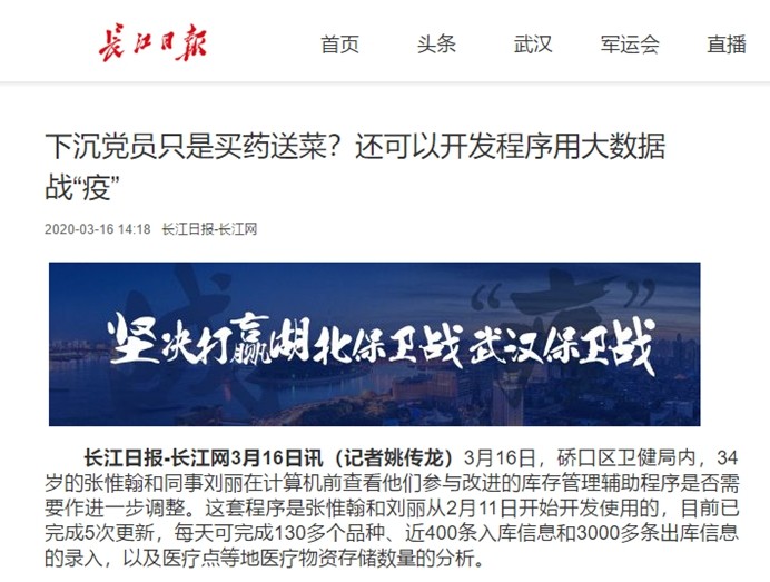 3月16日,硚口区卫健局内,34岁的张惟翰和同事刘丽在计算机前查看他们参与改进的库存管理辅助程序是否需要作进一步调整。这套程序是张惟翰和刘丽从2月11日开始开发使用的,目前已完成5次更新,每天可完成130多个品种、近400条入库信息和3000多条出库信息的录入,以及医疗点等地医疗物资存储数量的分析。