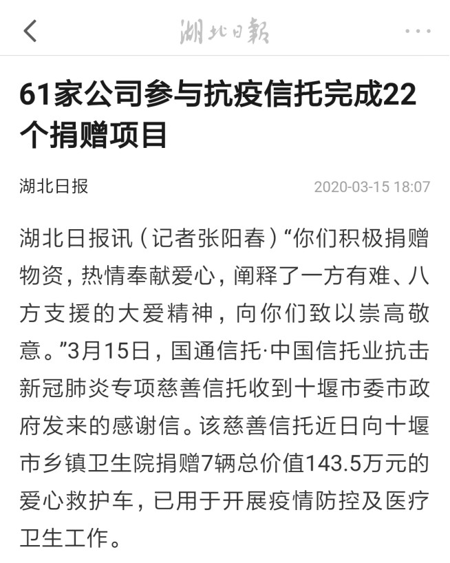 湖北日报:61家公司参与抗疫信托完成22个捐赠项目