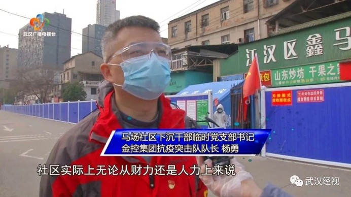 江汉区唐家墩街工委副书记郭赟:按照区委组织部的要求,我们在各个社区成立了临时党支部,让我们的下沉干部、双进双服务的干部和志愿者党员同志们凝聚在一起,发挥组织的作用,凝聚人心,更好地为居民群众提供生活保障。