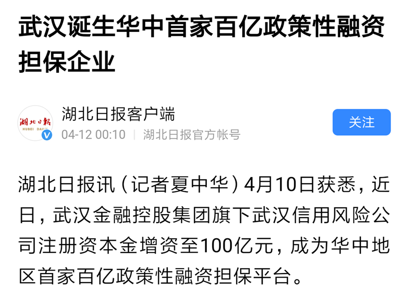 4月10日获悉,近日,武汉金融控股集团旗下武汉信用风险公司注册资本金增资至100亿元,成为华中地区首家百亿政策性融资担保平台。