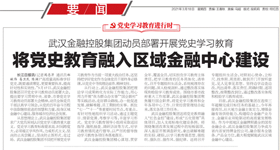 武汉金融控股集团精心谋划、贯穿全年、覆盖全员,切实担负学习教育主体责任,把学习教育的任务具体化、清单化,召开专题组织生活会,系统梳理存在的问题,深入检视剖析,通过整改落实体现和检验学习教育成效。围绕市委市政府重大工作部署,武汉金融控股集团聚焦履行国企职责,将党史学习教育和全年各项中心工作、日常经营管理结合起来,落实各项工作任务。