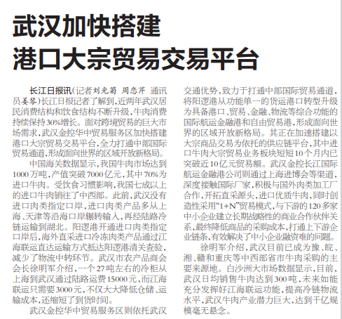 长江日报记者了解到,近两年武汉居民消费结构和饮食结构不断升级,牛肉消费持续保持30%增长。面对跨境贸易的巨大市场需求,av在线 华中贸易服务区加快搭建港口大宗贸易交易平台,全力打通中部国际贸易通道,形成面向世界的区域开放新格局。