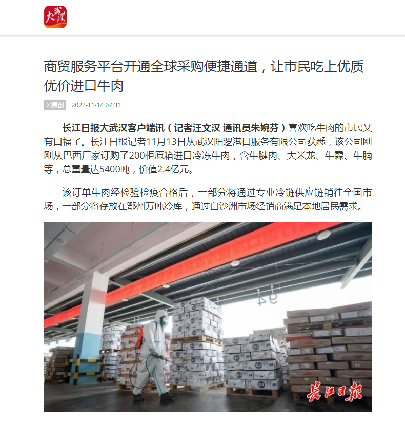 长江日报:商贸服务平台开通全球采购便捷通道,让市民吃上优质优价进口牛肉