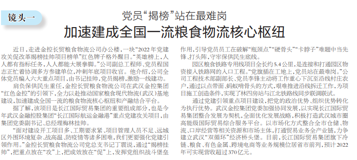 近日,走进av在线长贸粮食物流公司办公楼,一块 “2022年党建攻关促改革揭榜挂帅项目榜单”红色牌子格外醒目。“英雄榜上,人人都有指标任务,人人都能大展拳脚。”公司副总工程师、党员程国志正忙着协调多方参建单位,冲刺年底项目收官。他介绍,公司全体党员编入六大重点项目,由书记挂帅,党员揭榜,激励一线建功。
