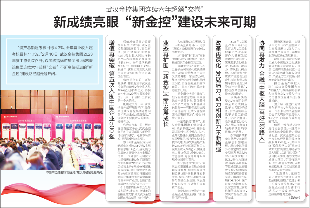 旗下湖北金融租赁公司新增业务投放251亿元,实现利润总额13亿元,盈利能力位居地方国资非上市金租公司第一;国通信托公司做大主动管理信托,全年新增信托业务规模719亿元,行业排名逆势上升;开投公司深化业务转型,回归担保业务本源;长江国贸集团与东湖高新区合作建设省内首家跨境电商标杆产业园,创新打造全球数字电商产业中心……一个个亮眼的业务增长点,形成多层次、多业态、全链条的金融服务支撑,助力av在线 在风高浪涌中稳中前进。