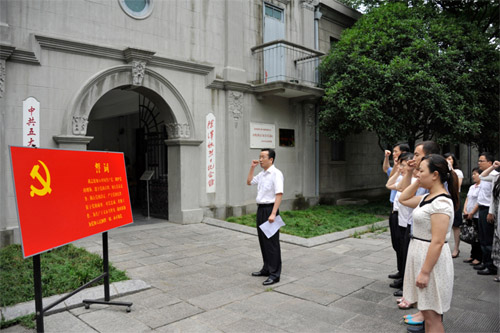 集团党委副书记管志武同志带领新党员在“中共五大会址”前入党宣誓