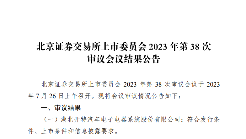7月26日,北京证券交易所上市委员会召开2023年第38次审议会议,集团旗下九州证券独家保荐的湖北开特汽车电子电器系统股份有限公司IPO申请获通过。